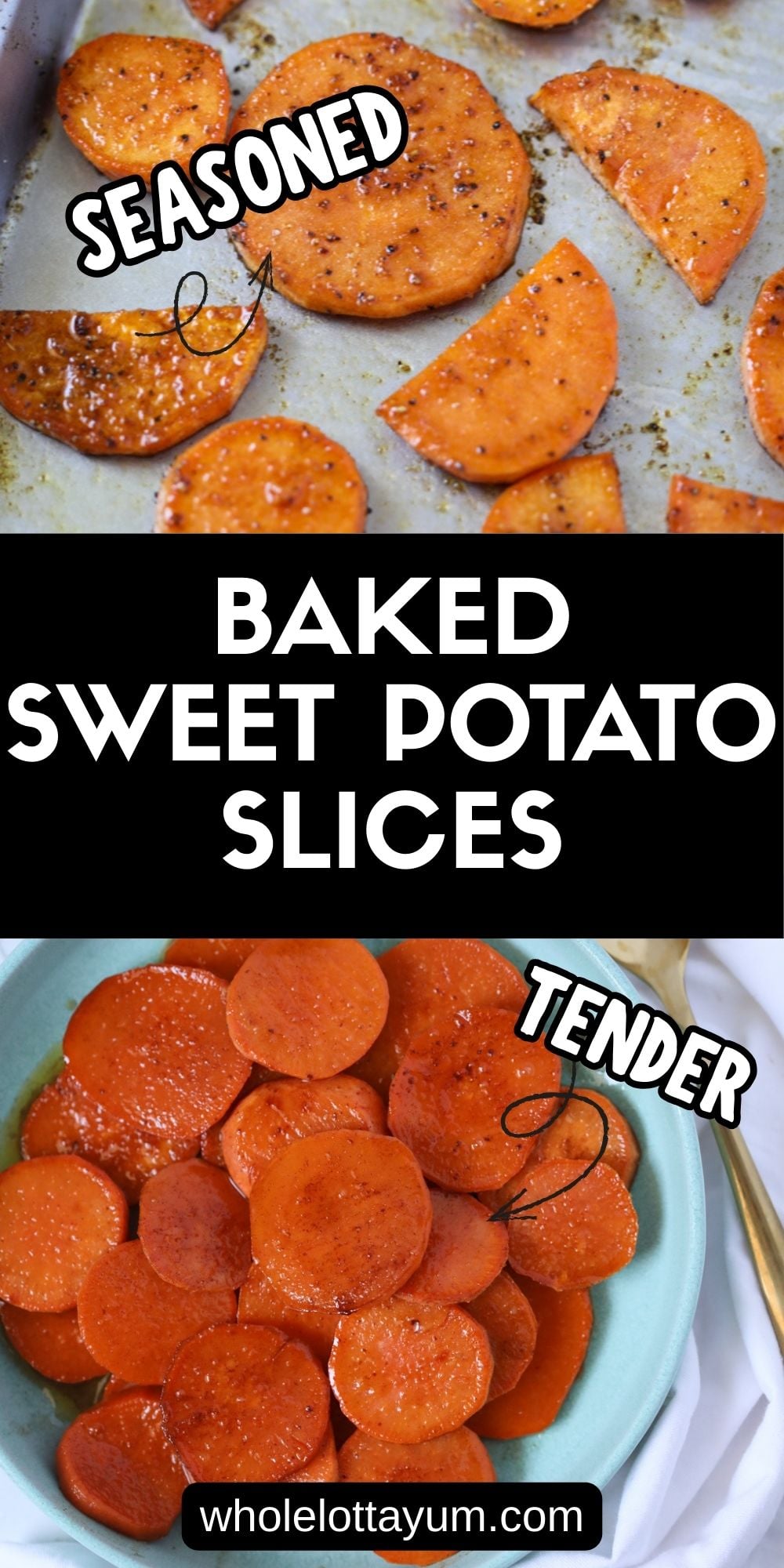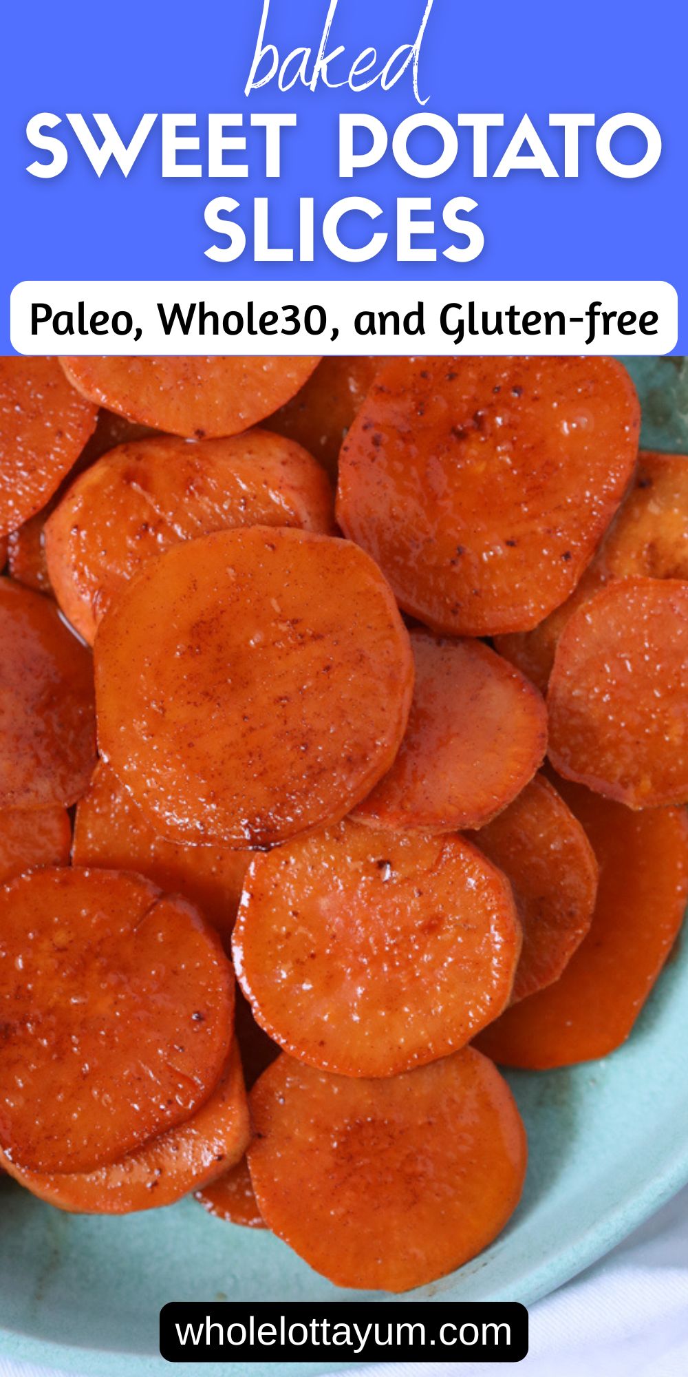 You'll love our baked sweet potato slices recipe that tastes like a sweet potato casserole but is much healthier! Make the roasted sweet potato slices savory or sweet. Paleo, Whole30, and gluten-free. It's a WHOLE LOTTA YUM!