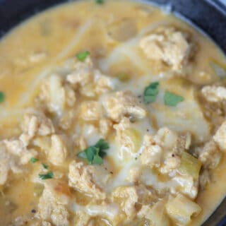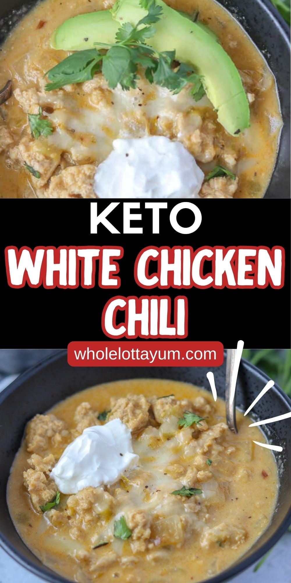 This keto chicken chili recipe is a quick stovetop version of our keto chili without beans, except we swapped chicken for beef, green salsa for red sauce, and added cream and cheese.